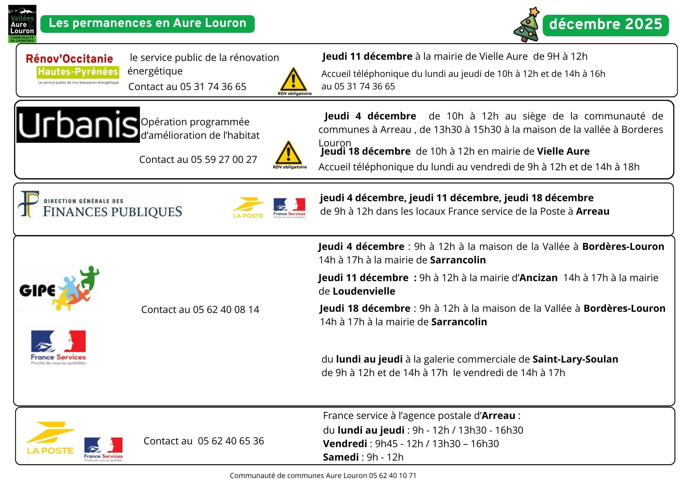 Les permanences en Décembre 2025 : Renov'Occitanie, OPAH, DDFIP, France Services, Maison du travail saisonnier, CIDDF, Mission Locale, Accompagnement social